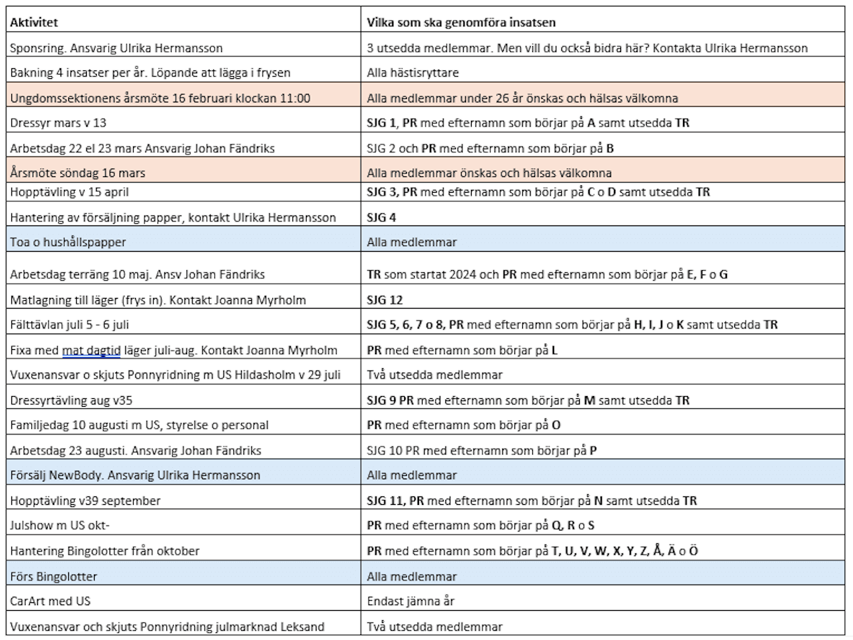 Här nedan ser du vilka insatser du är inplanerad på. Titta här och skriv redan nu in i din kalender när det är insatsdags. Om du inte kan ett visst datum är du ansvarig för att själv hitta ersättare och meddela den som är/kommer att vara ansvarig för uppgiften.