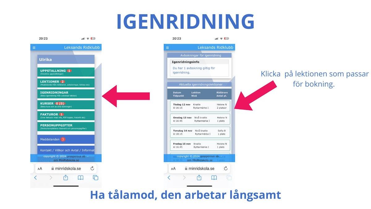 - Igenridningen måste ridas igen under samma termin. Det betyder vet du att du inte kan vara med de sista gångerna så avboka direkt. För direkt du avbokat ett datum kan du rida igen det, även om det ligger i framtiden.